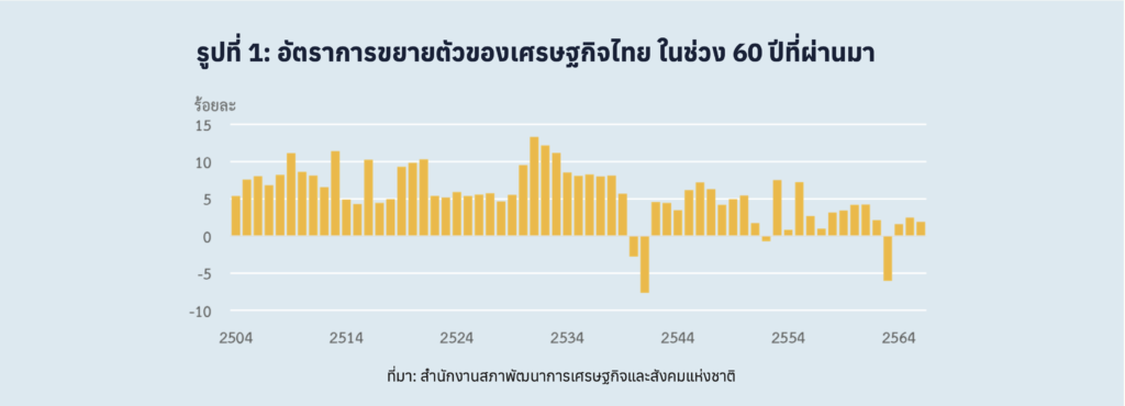 1. ความอ่อนแอของระบบเศรษฐกิจ ปัญหาสำคัญสุดที่ไทยกำลังเผชิญอยู่ คือ การที่อัตราการเจริญเติบโตของประเทศลดลงอย่างต่อเนื่อง จากเดิมที่ประเทศไทยสามารถขยายตัวได้เฉลี่ยประมาณปีละ 7.5% ก่อนเกิดวิกฤตเศรษฐกิจครั้งใหญ่ในปี 2540 โดยหลังจากนั้น อัตราการขยายตัวลดลงมาที่ 4-5% ต่อมาหลังเกิดวิกฤตการเงินโลกในปี 2551 อัตราการขยายตัวของไทยได้ลดลงอีกครั้ง มาเฉลี่ยที่ประมาณ 3.5% และท้ายสุด หลังปัญหาการแพร่ระบาดของเชื้อไวรัสโควิด-19 คลี่คลายลง อัตราการขยายตัวของเศรษฐกิจไทยได้ลดลงเหลือเฉลี่ยต่ำกว่า 2% (รูปที่ 1) ซึ่งเป็นอัตราการเจริญเติบโตที่ต่ำสุดประเทศหนึ่งในภูมิภาคอาเซียน