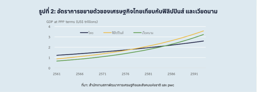 หากไทยยังไม่สามารถแก้ไขปัญหาการติดหล่มทางเศรษฐกิจ ที่ทำให้เศรษฐกิจโตช้าต่อเนื่องเช่นนี้ ในช่วงต่อไป จากการประมาณการของ PwC เศรษฐกิจไทยที่เคยเป็นเศรษฐกิจใหญ่อันดับ 2 ของอาเซียนรองจากอินโดนีเซีย ก็จะถูกแซงโดยเศรษฐกิจฟิลิปปินส์และเศรษฐกิจเวียดนามในปี 2578 และปี 2585 ตามลำดับ (รูปที่ 2)