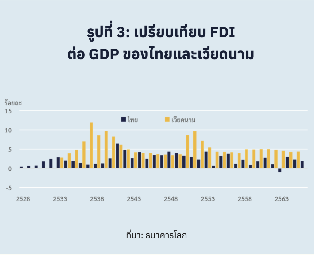 ทำให้นักลงทุนต่างประเทศจะมองข้ามเศรษฐกิจไทยมากขึ้น ดังที่เห็นได้จากเงินลงทุนจากต่างประเทศซึ่งเลือกที่จะไหลไปลงทุนที่ประเทศเพื่อนบ้าน ทั้งในอินโดนีเซียและเวียดนาม ทั้งนี้ ตัวเลขการลงทุนโดยตรง FDIs ที่ไหลไปที่เวียดนามในช่วงที่ผ่านมา มีจำนวนมากกว่าที่ไหลมาลงทุนในไทยถึง 3 เท่าตัว (รูปที่ 3)