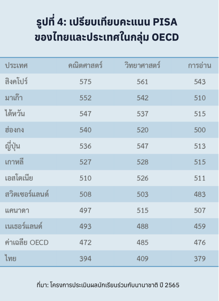 และเมื่อเทียบกับประเทศเพื่อนบ้านอาเซียน ผลการสอบของไทยอยู่ในลำดับที่ 5 รองจากสิงคโปร์ เวียดนาม บูรไน และมาเลเซีย โดยเด็กไทยมีคะแนนในวิชาภาษาอังกฤษ คณิตศาสตร์ และวิทยาศาสตร์ อยู่ในระดับที่ต่ำกว่าค่าเฉลี่ยของ OECD อย่างมีนัยยะสำคัญ (รูปที่ 4)