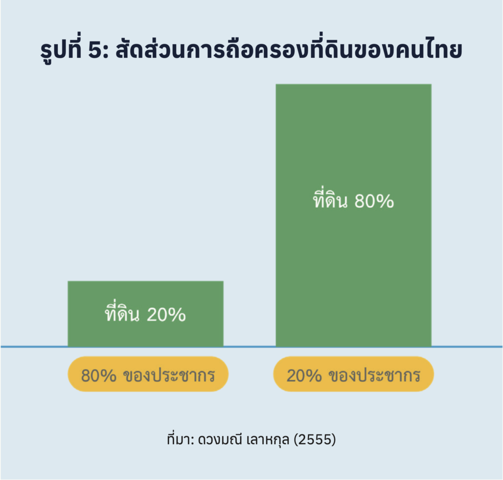 3. ความอ่อนแอของฐานราก ปัญหาสำคัญอีกด้าน คือ ปัญหาความเหลื่อมล้ำที่กำลังเพิ่มขึ้นอย่างต่อเนื่องในหลายมิติ โดยเฉพาะอย่างยิ่งด้านความมั่งคั่ง ในส่วนของการถือครองทรัพย์สินและที่ดิน ซึ่งจากข้อมูลพบว่า ในบัญชีเงินฝากทั้งหมด 110 ล้านบัญชีของประเทศ บัญชีเงินฝากเพียงประมาณแสนกว่าบัญชี ถือครองเงินฝากมากกว่า 50% ของประเทศ ขณะที่อีก 95 กว่าล้านบัญชีมีเงินฝากรวมกันเพียง 3% โดยเฉลี่ยอยู่ที่ประมาณบัญชีละ 4-5 พันบาทเท่านั้น นอกจากนี้ จากข้อมูลพบว่า คนที่รวยสุด 20% ของประเทศ ถือครองที่ดินรวมกันประมาณ 80% ของที่ดินทั้งหมด ขณะที่คนจนสุด 20% ถือครองที่ดินรวมกันเพียง 0.25% หรือต่างกันประมาณ 300 เท่า (รูปที่ 5)