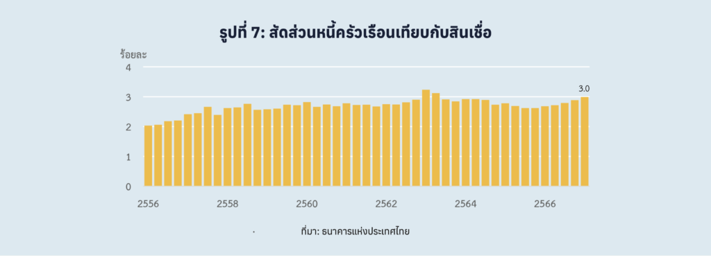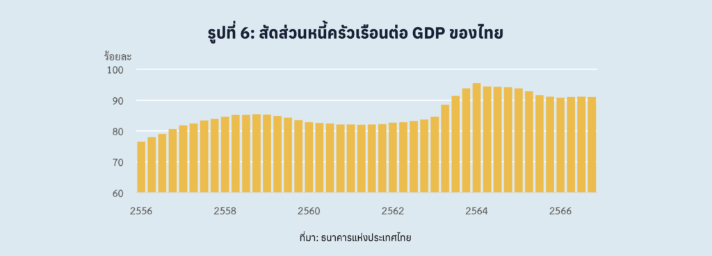 ทั้งนี้ ภาคการเกษตรไทยในชนบท มีประชาชนอยู่ประมาณ 20 ล้านคนหรือประมาณ 30% ของประชากร แต่กลับมีส่วนแบ่งของ GDP ไทยลดลงต่อเนื่อง ล่าสุดอยู่ที่ประมาณ 9% โดยการพัฒนาในช่วงที่ผ่านมาได้ส่งผลให้พื้นที่ชนบทอ่อนแอลง ครอบครัวในชนบทมีรายได้ที่ไม่พอกับรายจ่าย ต้องมีหนี้ทั้งในระบบและนอกระบบ สุดท้ายต้องขายที่ดินที่มีอยู่ ต้องบุกรุกในพื้นที่สาธารณะ และพื้นที่ป่าของประเทศ นอกจากนี้ ครัวเรือนในชนบท กลายเป็นครอบครัวแหว่งกลาง หนุ่มสาวไปทำงานที่โรงงานในเมือง ฝากลูกๆ ไว้ให้ปู่ย่าตายายเลี้ยง ทำให้เด็กๆ ได้รับการเลี้ยงดูไม่เหมาะสม ล่าสุด การแพร่ระบาดของโควิด-19 ได้ส่งผลให้คนที่ฐานรากต้องกลายเป็นหนี้มากขึ้น ล่าสุด หนี้ครัวเรือนไทยอยู่ในระดับที่สูงกว่า 90% ของ GDP (รูปที่6) มากเป็นอันดับต้นๆ ของกลุ่มประเทศกำลังพัฒนาของโลก ซึ่งช่วงที่เศรษฐกิจฟื้น ครัวเรือนกลับไม่สามารถฟื้นตัวได้ ล่าสุดไม่สามารถชำระหนี้ได้กลายเป็น NPL ในอัตราที่มากขึ้นอย่างเห็นได้ชัด (รูปที่ 7)