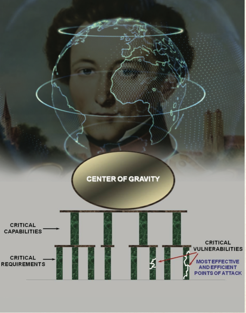 แนวคิดนี้ได้รับการพัฒนาขึ้นโดยคาร์ล ฟอน เคลาเซวิทซ์ นักทฤษฎีการทหารปรัสเซียน ในผลงานสำคัญของเขา “On War ” โดยมองว่า CoG ไม่จำเป็นต้องเป็นวัตถุหรือสถานที่ แต่สามารถเป็นองค์ประกอบสำคัญทางกลยุทธ์ ความสามารถพิเศษของฝ่ายตรงข้าม หรือแม้แต่เจตจำนงทางการเมืองที่คอยขับเคลื่อนการต่อสู้ หากสามารถโจมตี CoG ได้สำเร็จ จะสามารถทำให้ข้าศึกล่มสลายได้อย่างรวดเร็ว