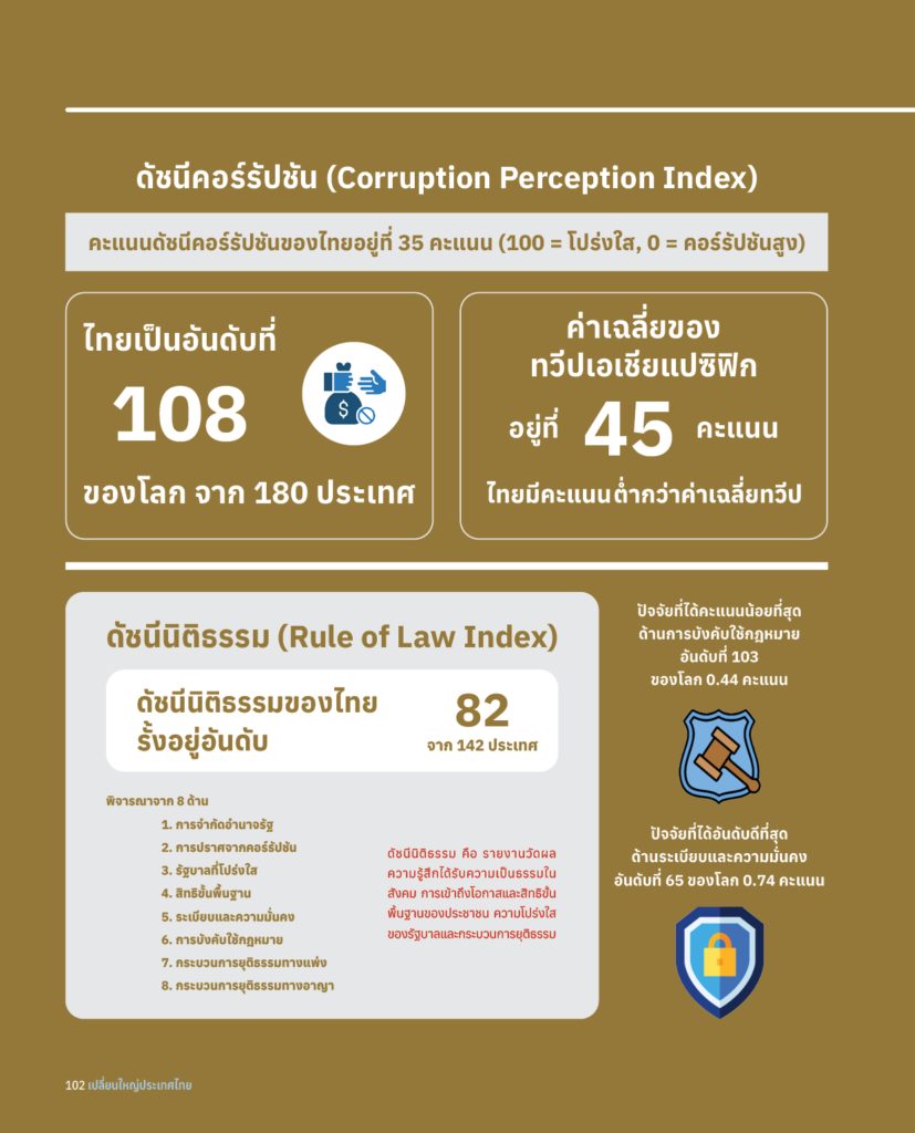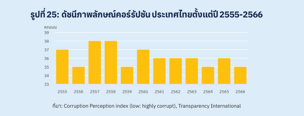 สิ่งที่น่ากังวลใจอย่างยิ่งสำหรับระบบราชการไทย ก็คือการที่ดัชนีสำคัญ ๆ ซึ่งใช้เปรียบเทียบมิติต่าง ๆ ของระบบราชการของประเทศ เช่น ดัชนี Corruption Perception Index ของ Transparency International พบว่า ไทยถูกจัดอยู่ที่อันดับ 108 จาก 180 ประเทศ จากเดิมอยู่อันดับที่ 88 เมื่อ 10 ปีที่แล้ว (รูปที่ 25) นอกจากนี้ ดัชนีนิติธรรม Rule of Law Index ของ World Justice Project ของประเทศไทย อยู่อันดับที่ 82 จาก 142 ประเทศ จากเดิมเมื่อ 8 ปีที่แล้ว อยู่ที่อันดับ 56 จาก 102 นอกจากนี้ การสำรวจของ World Economic Forum ที่สอบถามผู้บริหารระดับสูงของภาคเอกชนเมื่อปี 2560 ในสิ่งที่ผู้บริหารเหล่านี้กังวลใจที่สุดเกี่ยวกับการทำธุรกิจในไทย พบว่า 2 ใน 5 อันดับแรก คือ ความไม่มีประสิทธิภาพของระบบราชการ และปัญหาคอร์รัปชั่น