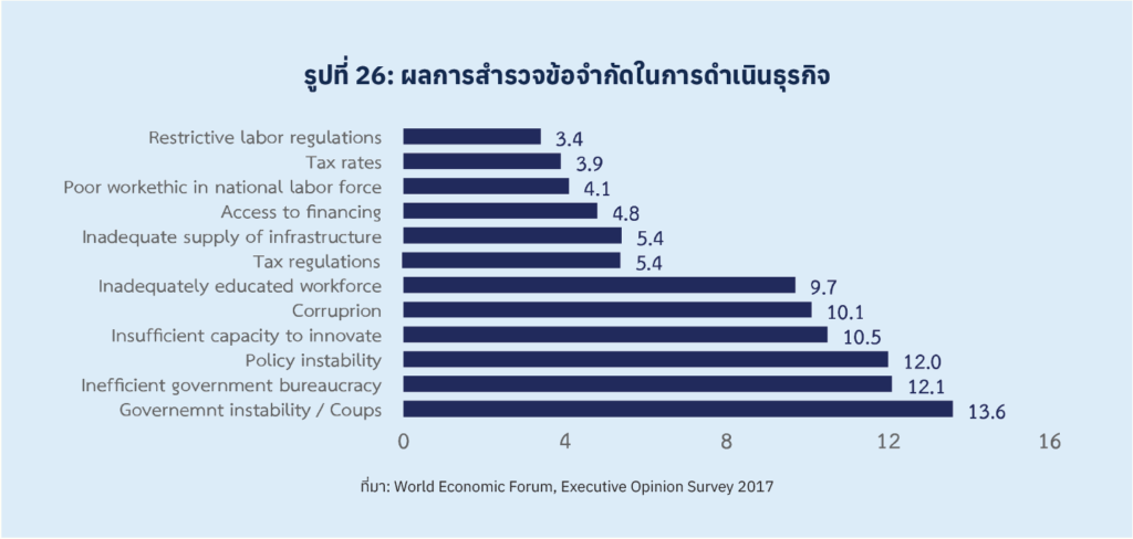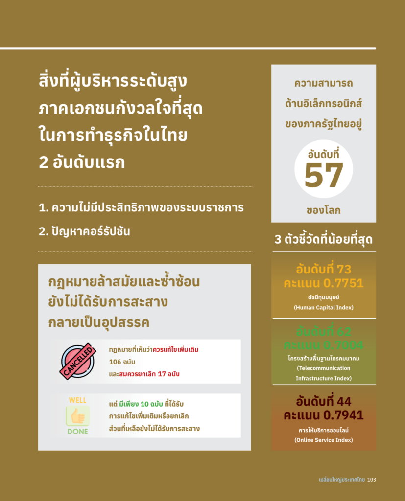ในอีกด้าน กฎหมายหลัก กฎหมายรอง กฏกระทรวง ระเบียบ ข้อบังคับจำนวนมากของไทย ที่ล้าสมัย ที่ตกยุค ไม่สามารถเปลี่ยนแปลงให้ทันกับโลกที่กำลังรุดหน้าไปอย่างรวดเร็ว แต่ยังมีผลบังคับใช้อยู่ในปัจจุบันหลายฉบับ เป็นอีกข้อจำกัดสำคัญของไทย ที่ทำให้การดำเนินธุรกิจเป็นไปด้วยความยากลำบาก นับแต่การเปิดธุรกิจ การขอใบอนุญาตต่าง ๆ ที่ต้องมีการแยกขอตามกฎหมายต่าง ๆ ที่เกี่ยวข้อง ซึ่งข้อจำกัดในการทำธุรกิจจากกฏหมายที่ได้บังคับใช้มา 50-60 ปีเหล่านี้ บางส่วนได้กลายเป็นข้อจำกัดของประเทศในการก้าวขึ้นสู่ยุค Digital ที่ไม่ต้องการสำเนากระดาษ ยุค Globalization ที่ปัจจัยการผลิตสามารถเคลื่อนย้ายได้อย่างเสรี และเลือกที่จะลงทุนในพื้นที่ที่มีกฏระเบียบที่เป็นสากลเป็นหลัก (รูปที่ 26)