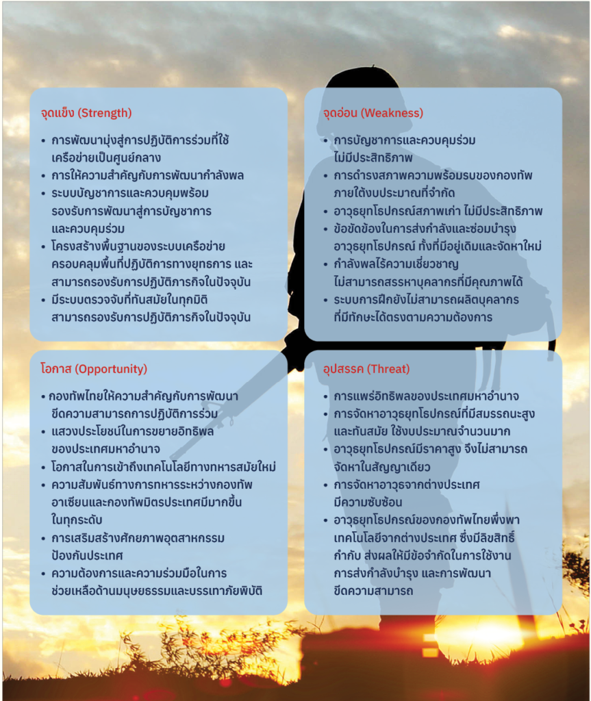 กองทัพไทยต้องกำหนดแนวทางการพัฒนาขีดความสามารถในทุกองค์ประกอบอย่างสมดุล เพื่อเป็นแนวทางให้แต่ละเหล่าทัพนำไปใช้ในการพัฒนาขีดความสามารถ อันจะนำไปสู่การบูรณาการขีดความสามารถการปฏิบัติการร่วมในทุกมิติ ภายใต้แนวคิดการปฏิบัติการที่ใช้เครือข่ายเป็นศูนย์กลาง (Network Centric Operations: NCO) โดยเฉพาะในภารกิจการป้องกันประเทศ การรักษาความมั่นคง การแก้ไขปัญหาความขัดแย้งบริเวณชายแดน การรักษาผลประโยชน์แห่งชาติทางทะเล ทางอากาศ และทางอวกาศ รวมทั้งการปฏิบัติการทางไซเบอร์ ทางอวกาศ และทางคลื่นแม่เหล็กไฟฟ้า อันจะนำไปสู่การพัฒนาขีดความสามารถมุ่งสู่การปฏิบัติการหลายมิติ (Multi-Domain Operations: MDO) เพื่อให้พร้อมรองรับภัยคุกคามและความท้าทายในปัจจุบันและมีแนวโน้มที่จะเกิดขึ้นในอนาคต